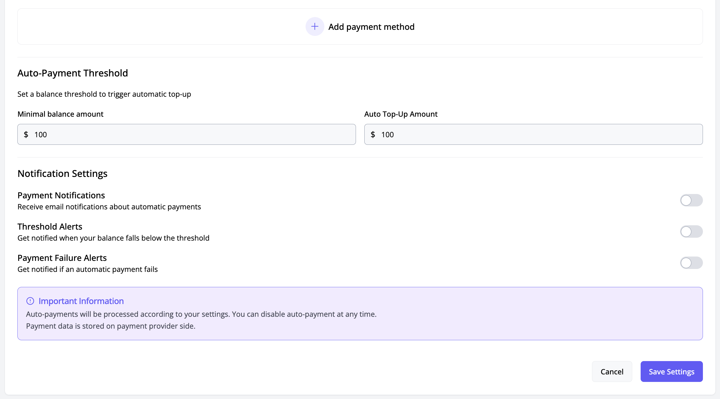 Automatic balance top-up is available if you have at least one saved payment method and one payer. This feature ensures your account maintains a minimum balance to avoid insufficient funds for automatic service renewals from balance.