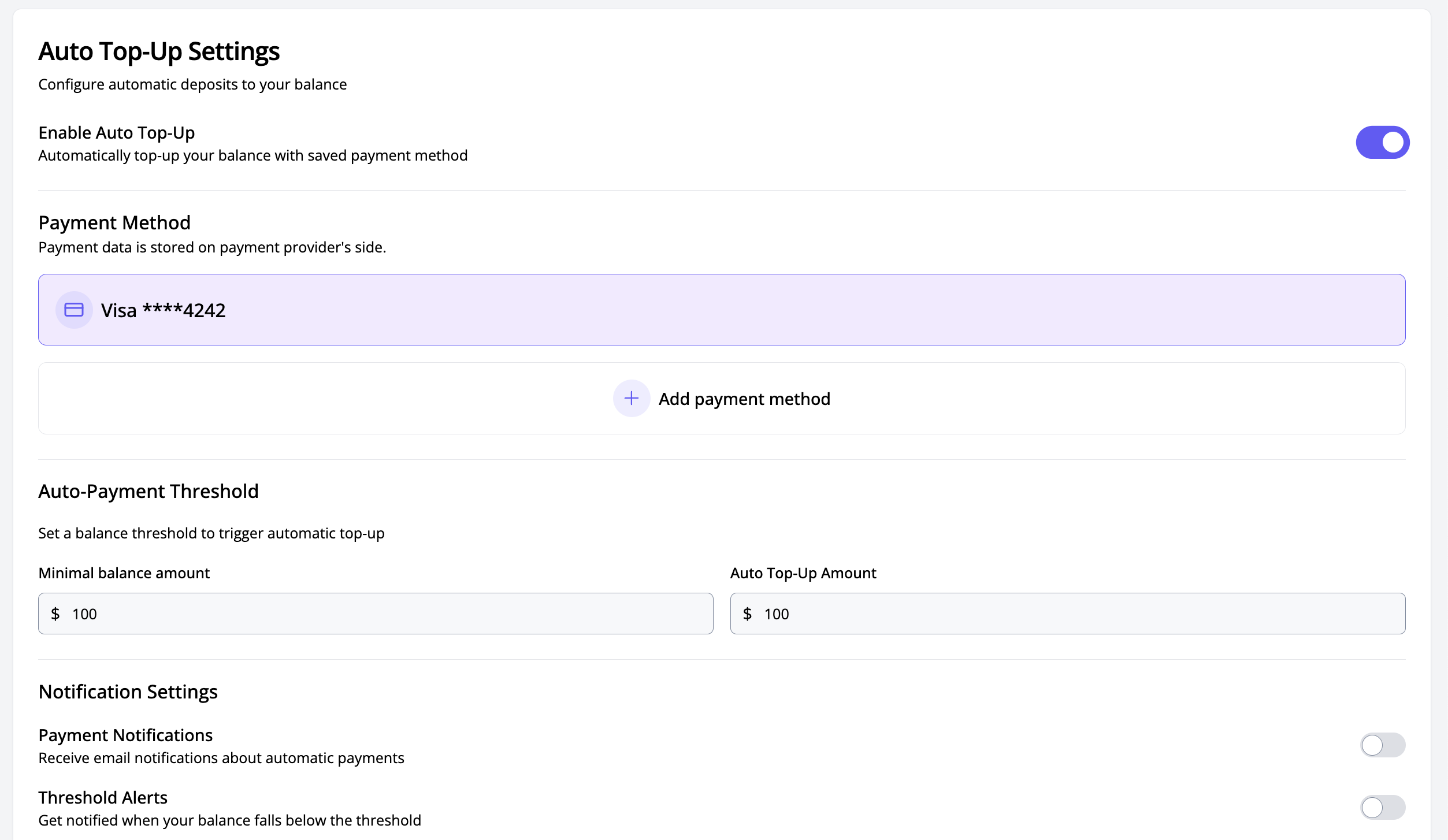 Email Notifications (optional): - For successful top-up transactions. - For failed top-up attempts. - When the balance approaches the threshold (below 110% of the specified minimum).