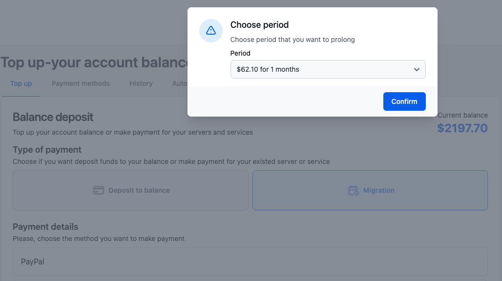 A modal window opens to choose the payment period (similar to server prolongation, but you cannot cancel the server selection — only choose the period and confirm).