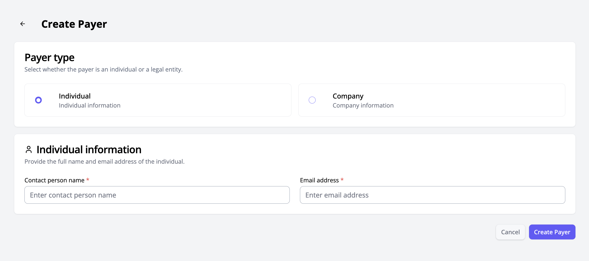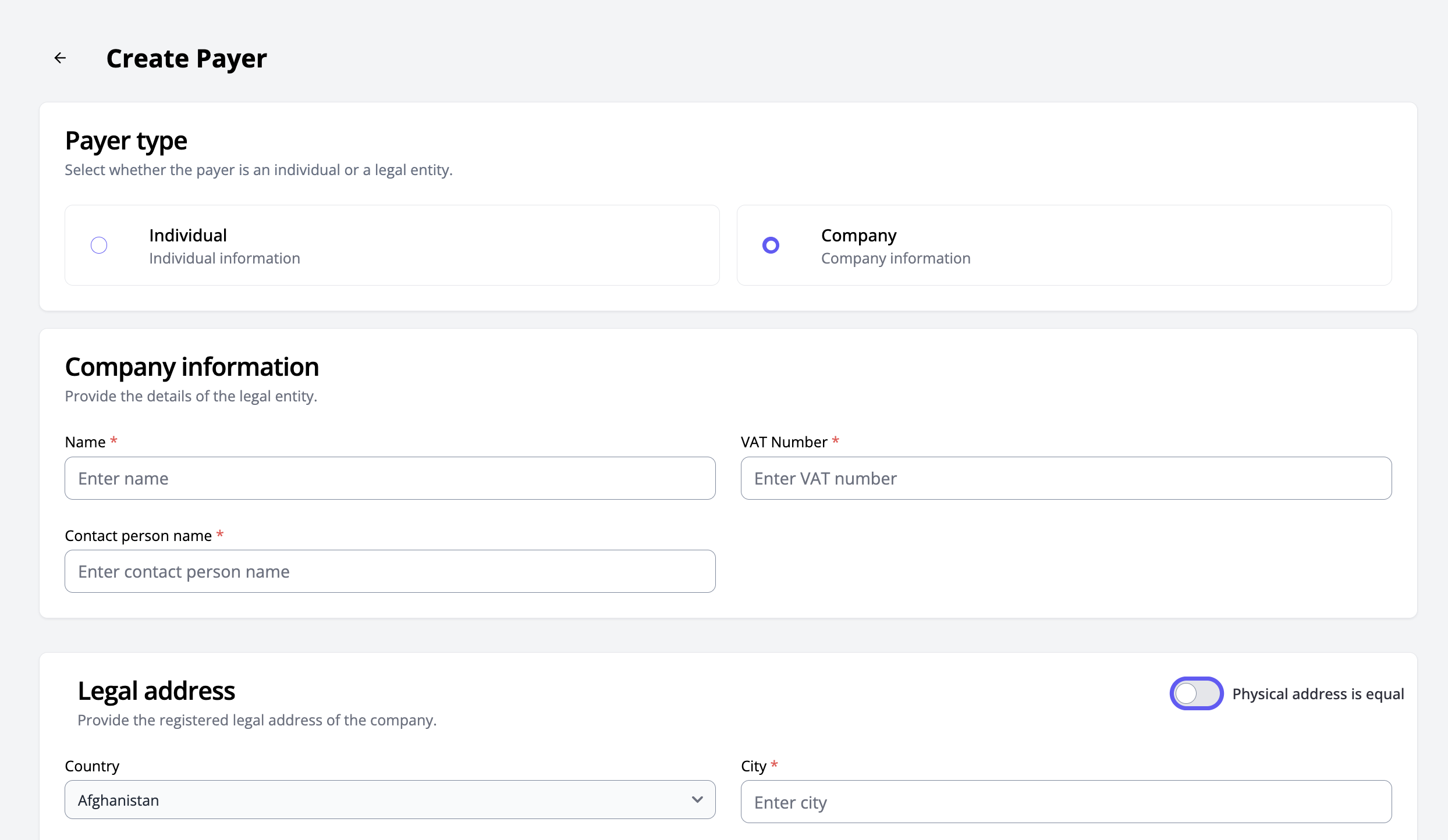 - Select the payer type: individual or company. Additional fields will appear based on your choice.