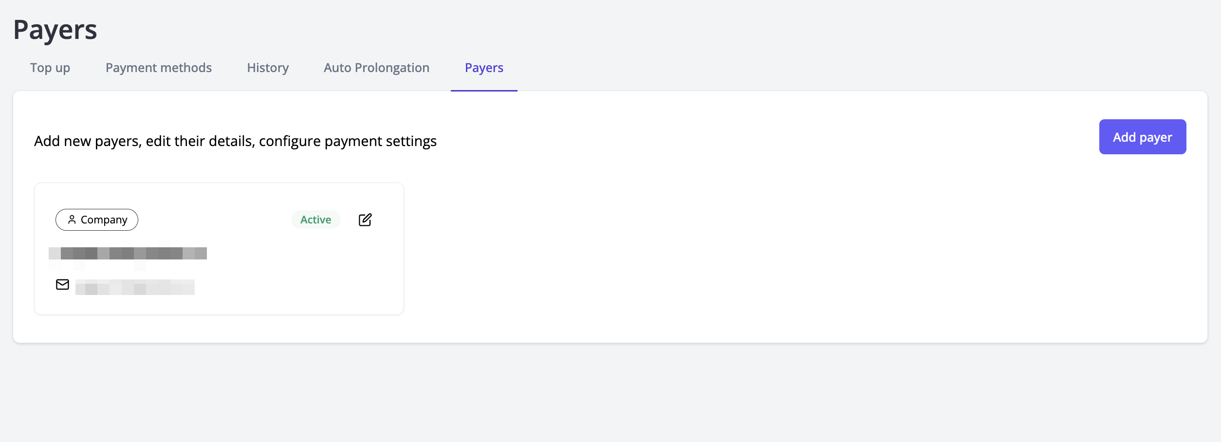 Note: Deactivating a payer (unchecking the activity box) disables all associated payment methods. These methods will no longer be used for automatic renewals, top-ups, or selection when ordering new servers or services.