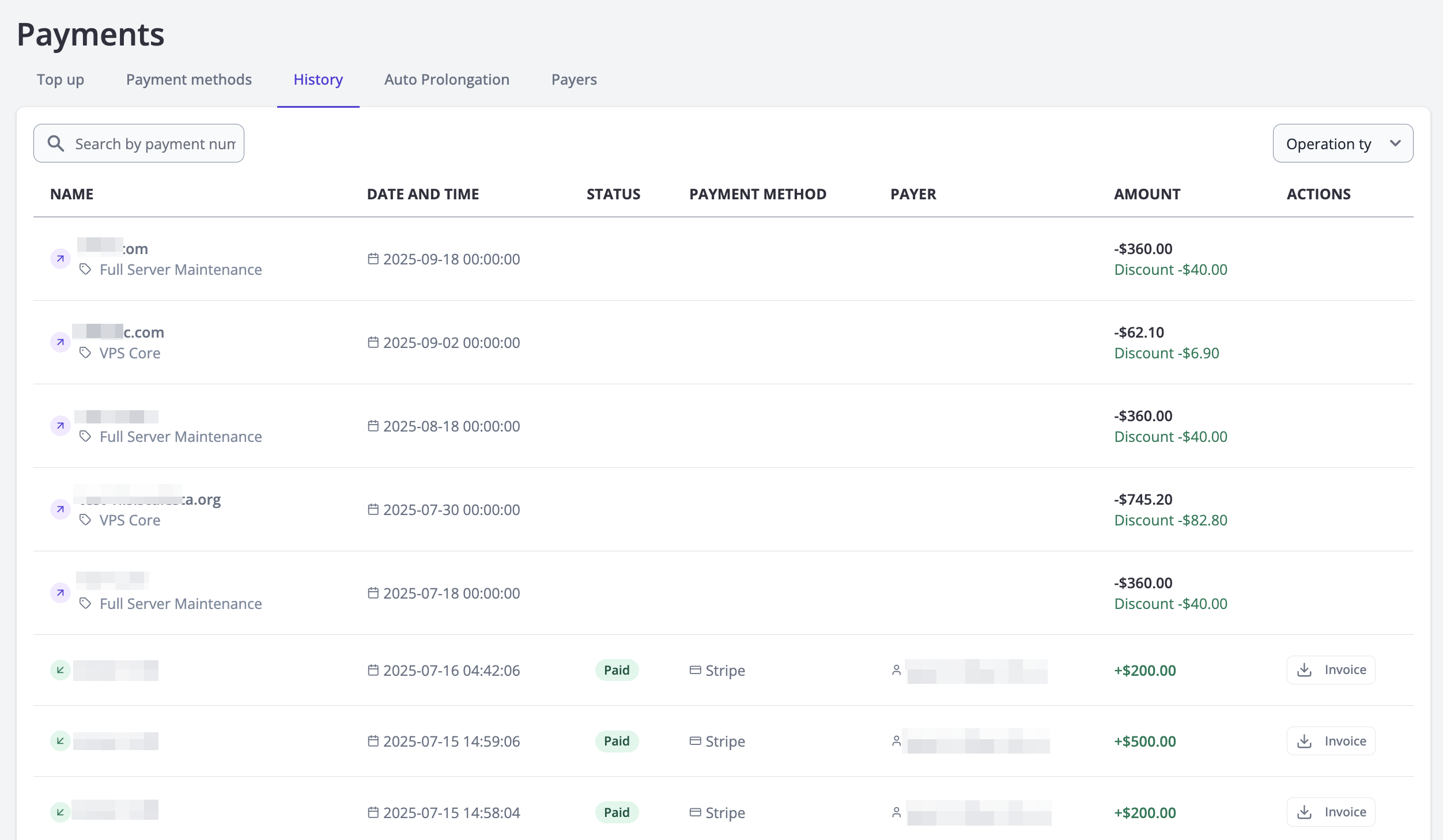 You can filter the list to show only specific types of transactions (payments or expenses). Search is available by payment number or the name of the service associated with an expense.