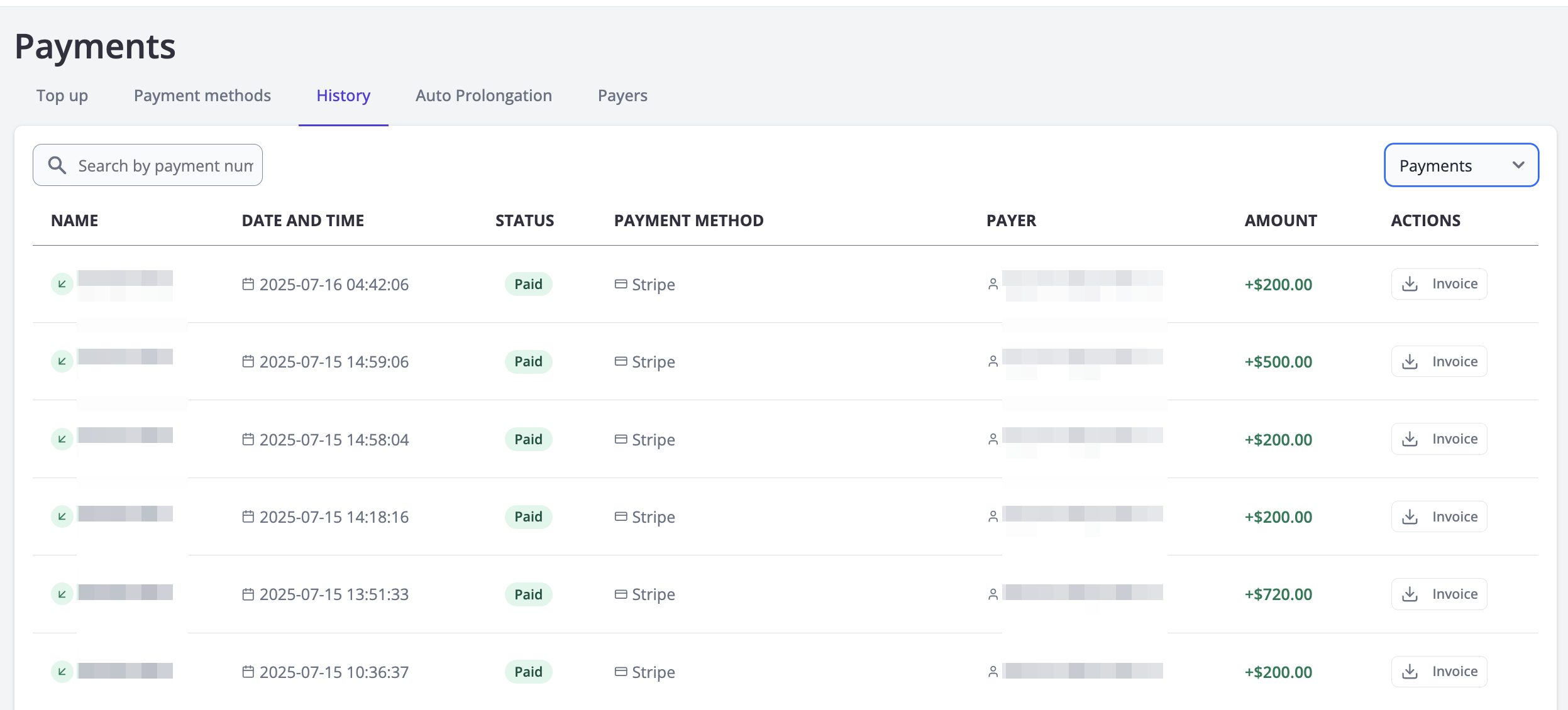 - You can download an invoice for each top-up by clicking the "Download" button.