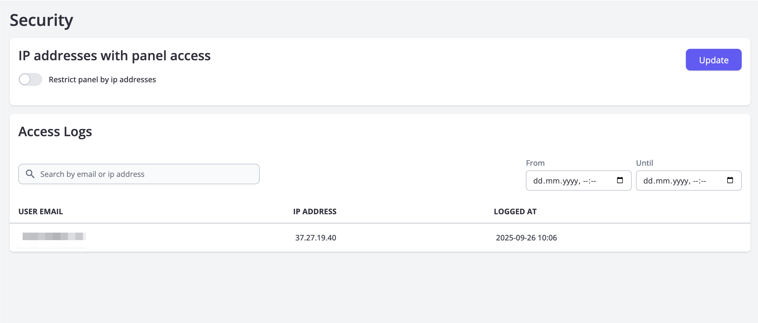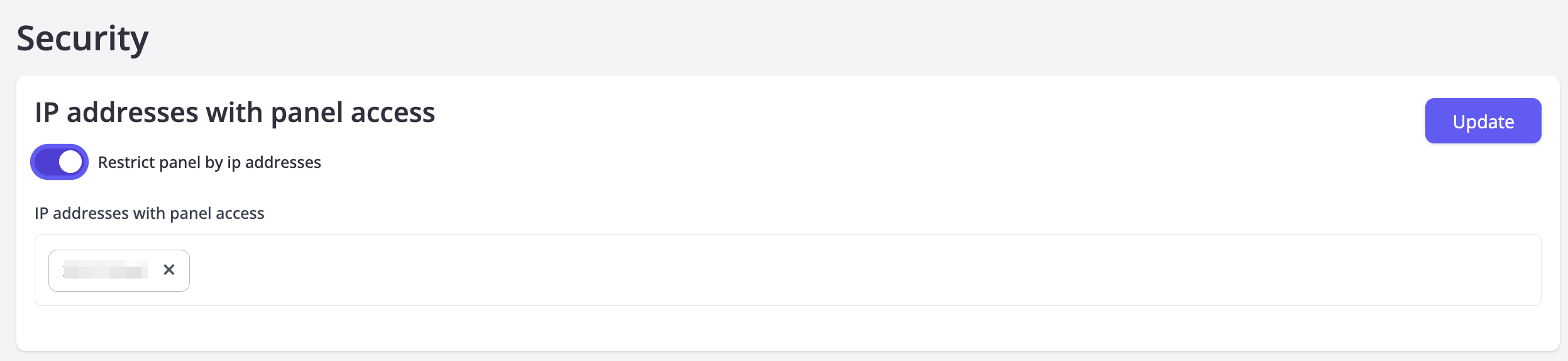 You can restrict access to the panel by IP address. To do this, click the "Restrict panel by ip addresses" toggle. After that, a field will appear where you can enter the IP addresses allowed to access the system. By default, your current IP address will be selected.