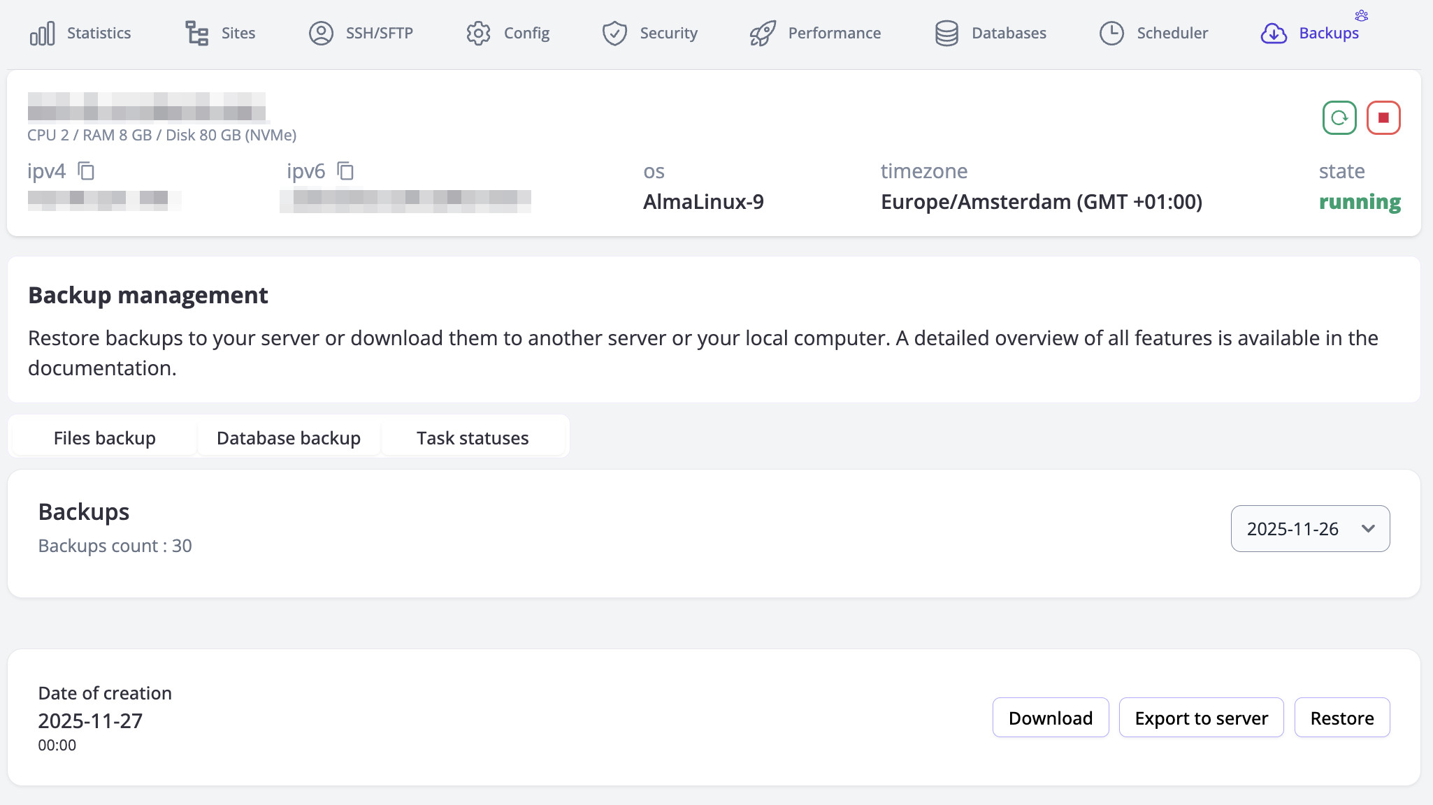In the Backups section, you can manage backups of your server data and database.