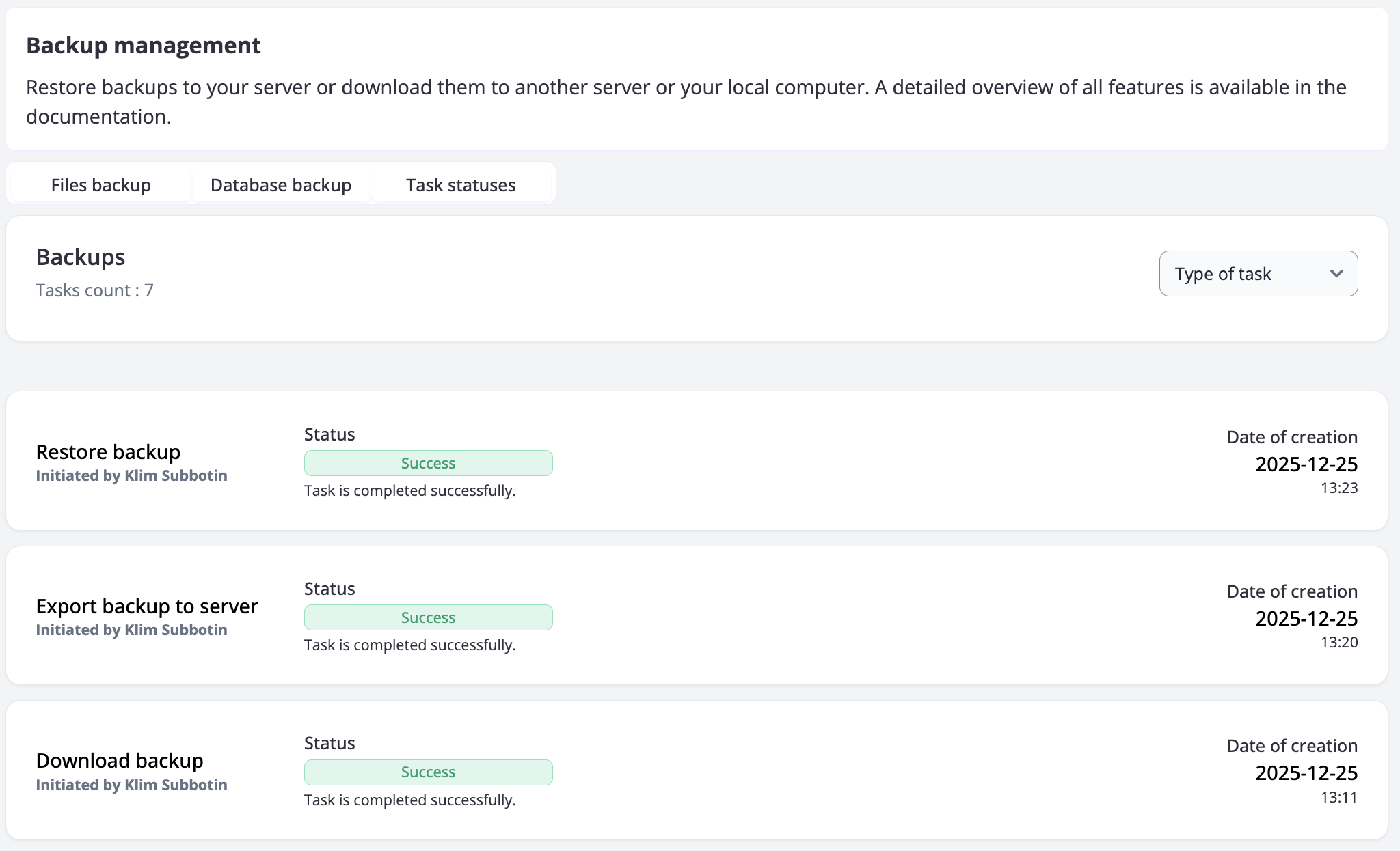 - The backup creation time is displayed according to the server’s time zone from which you are viewing the information.