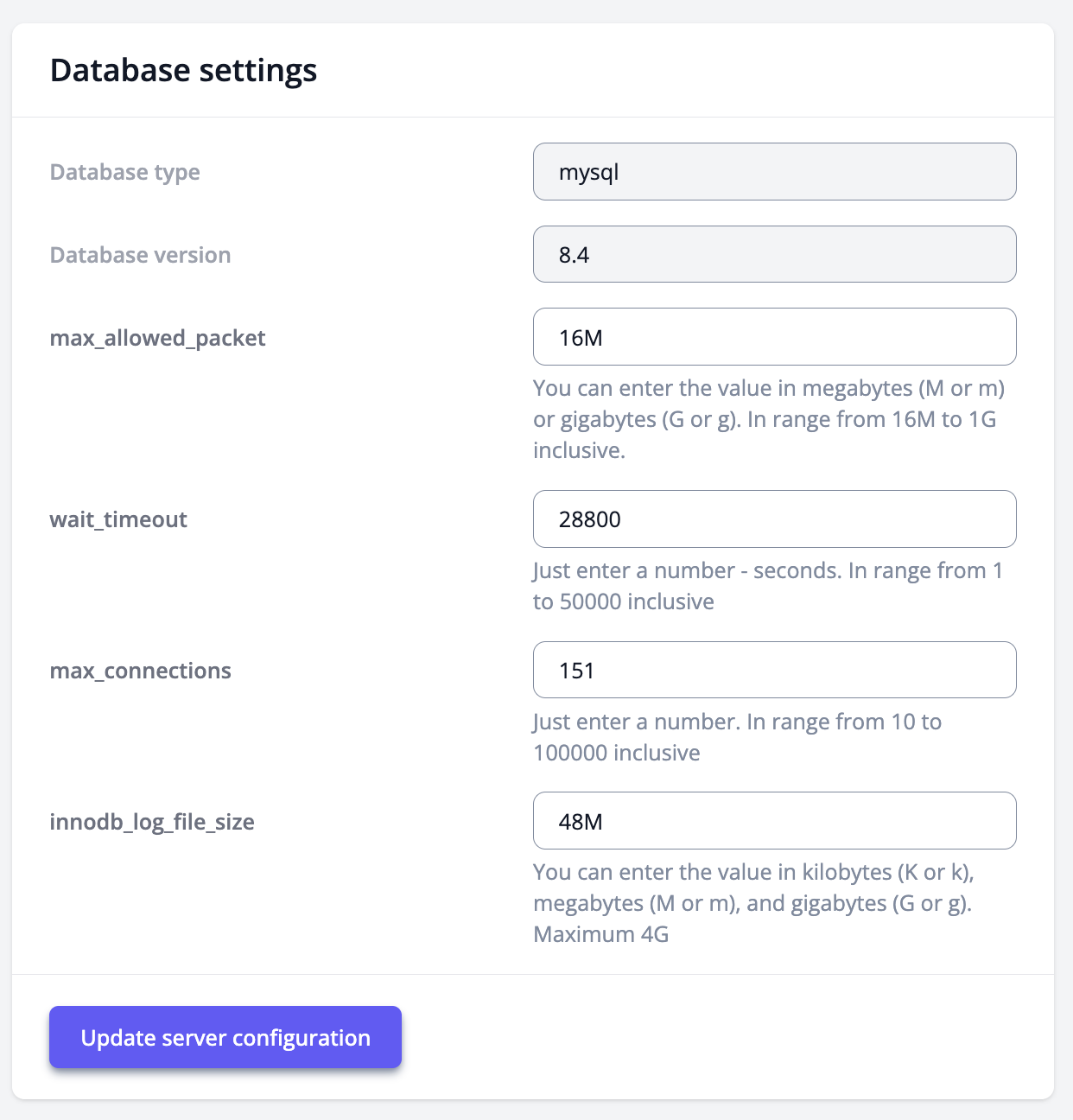In the MySQL settings sections you can change the values of the available MySQL parameters and apply the changes by clicking Update server configuration.