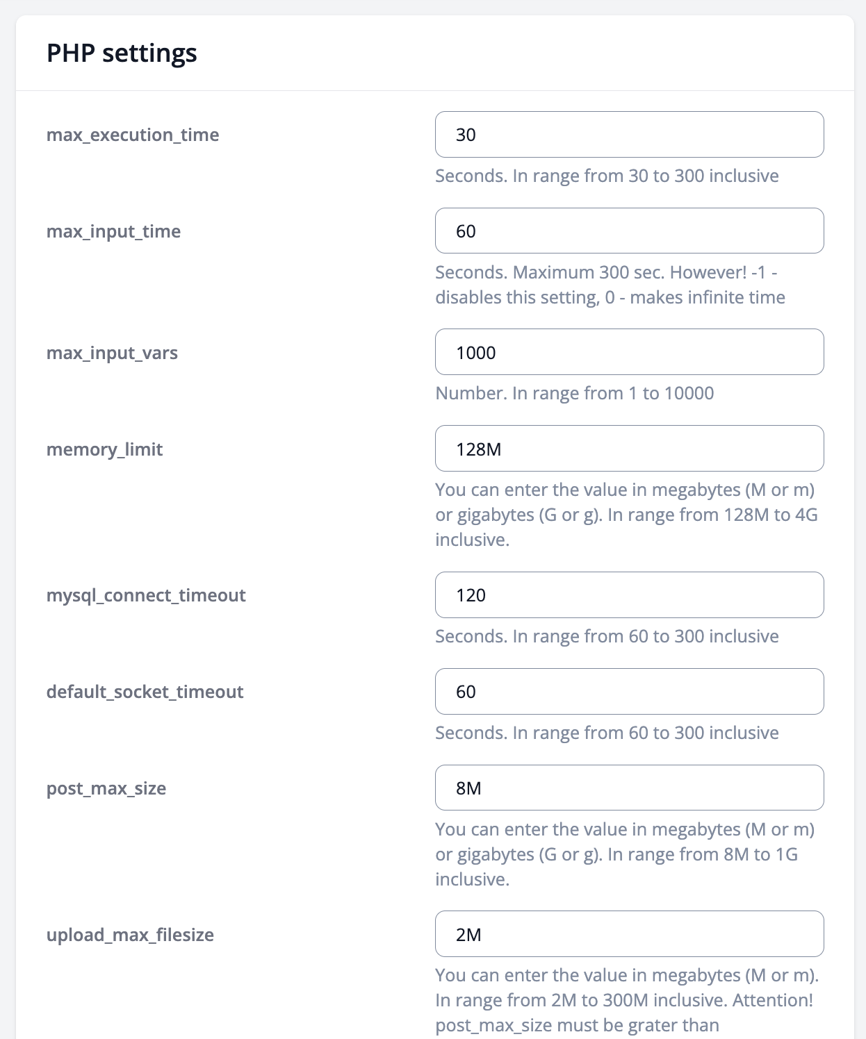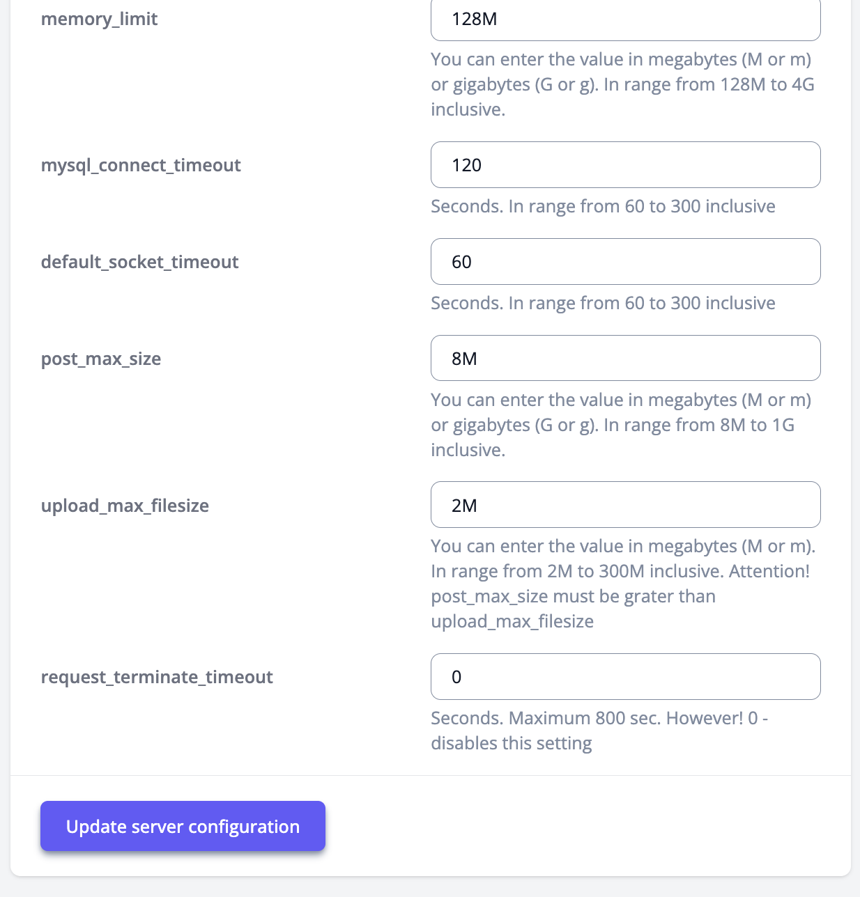 Here you can change the values of the PHP parameters to the necessary ones and Update server configuration in accordance with the PHP parameters changes.