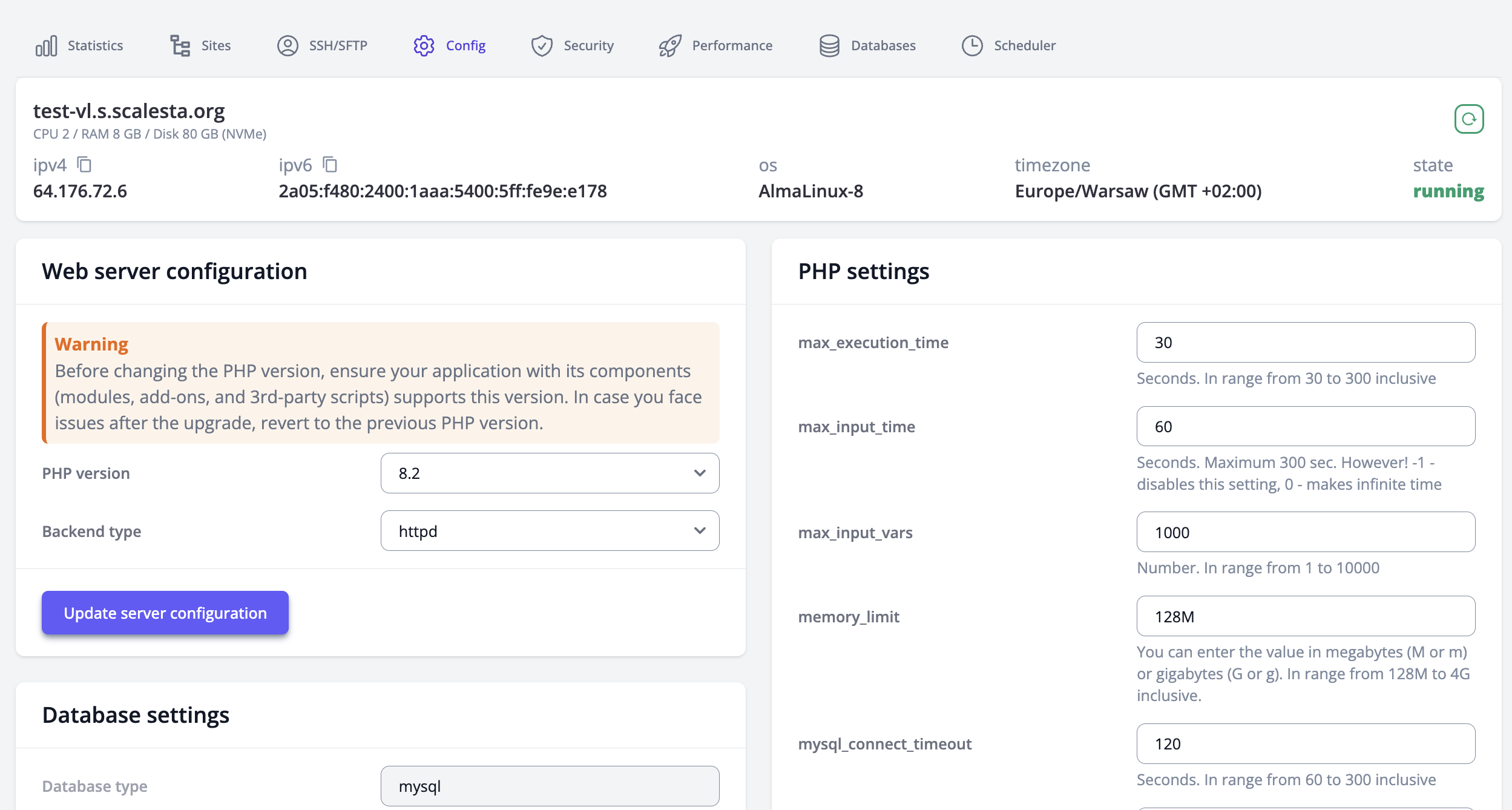 Changes in PHP & MySQL settings may require some special technical skills — do not apply the changes if you are not sure about them. If you have any uncertainty, contact us via Scalesta ticket, we are always ready to help and consult you on questions related to the server's configuration.