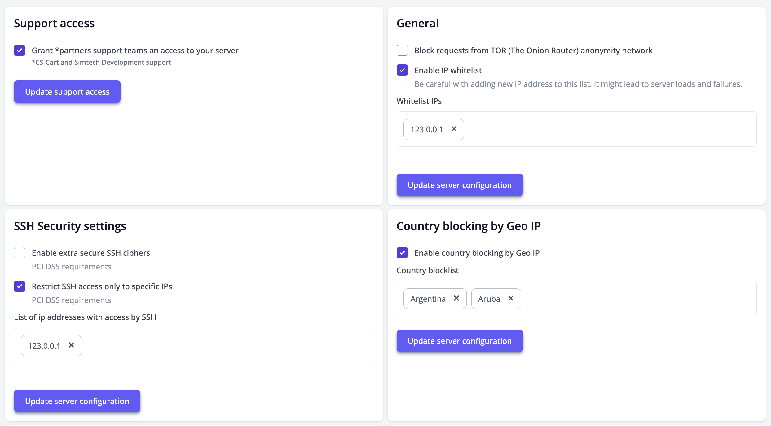 In the SSH security settings section you can manage the security settings related to the SSH/SFTP connection to your server. Here you can enable extra secure SSH ciphers that is one of the PCI DSS requirements and improves the overall security of your project. You can also enable SSH access restriction only to specific IPs and list the SSH addresses in the appropriate folder. When the settings are set up.