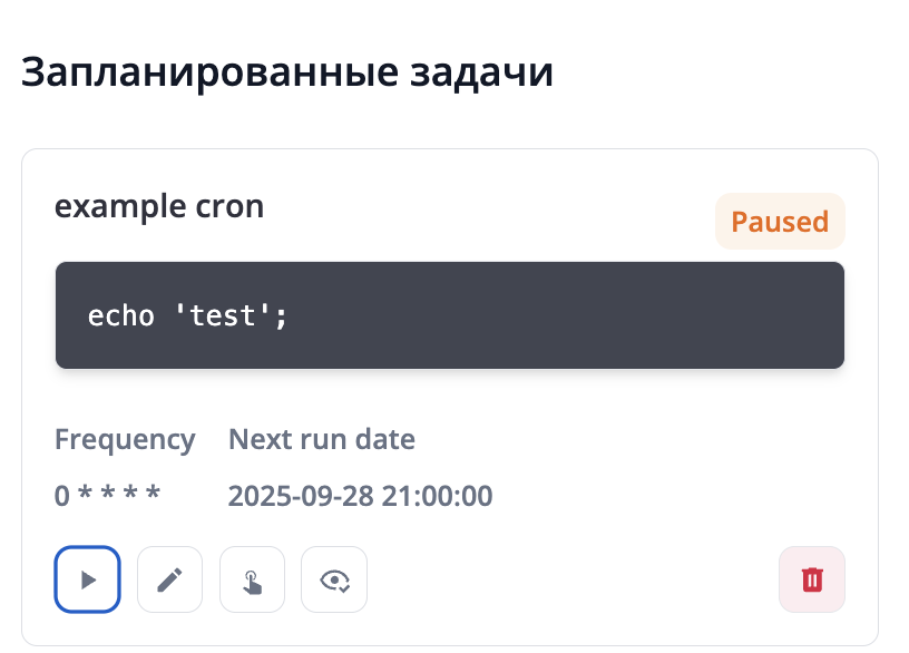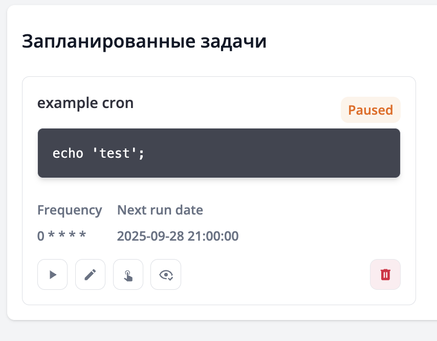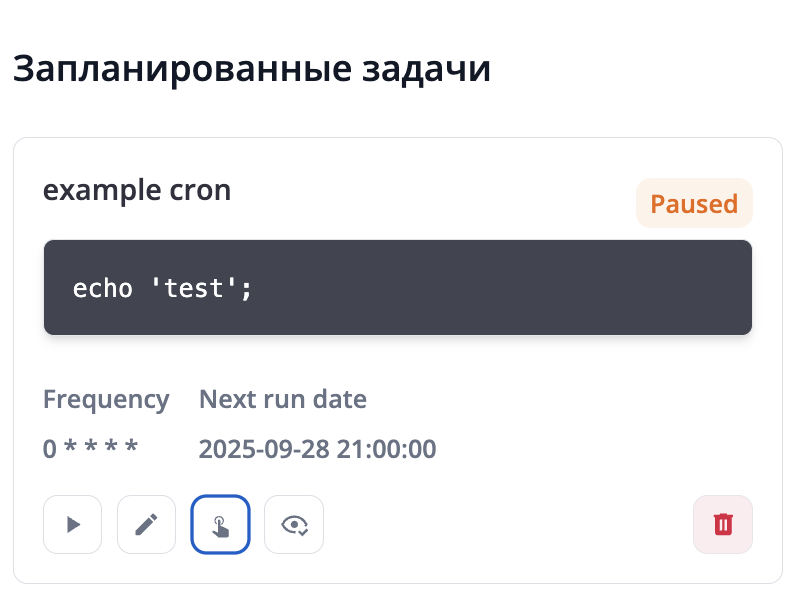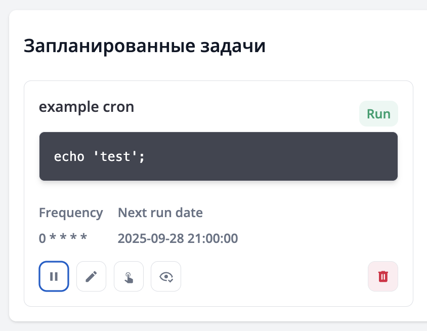 Все активные задачи отображаются в списке Запланированные задачи, где можно поменять частоту запуска задачи, и саму команду. Задачу можно отредактировать или удалить из планировщика, нажав Редактировать или Удалить задачу в меню Действия. Также здесь можно запустить команду вручную и посмотреть результаты ее выполнения.