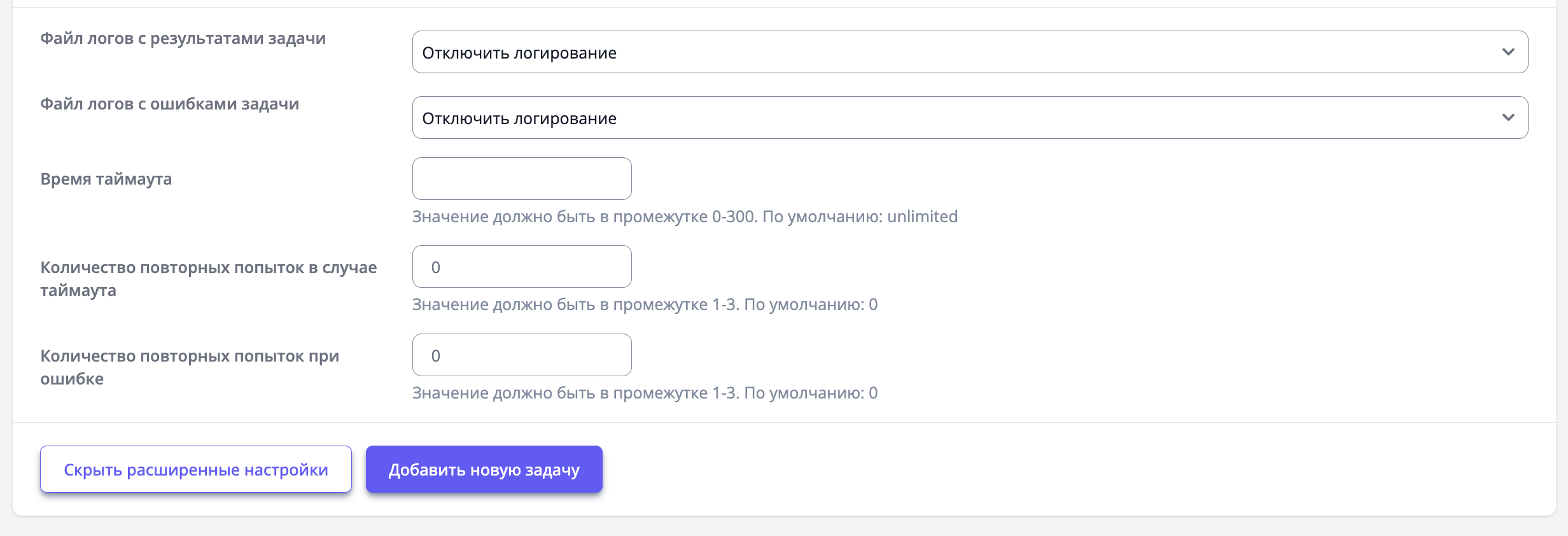 Если вы не используете почтовый сервер Scalesta, вам доступно только сохранение логов на сервере. Чтобы подключить его, выберите опцию "Сохранять логи вывода" для "Файл логов с результатами задачи" или для "Файл логов с ошибками задачи".