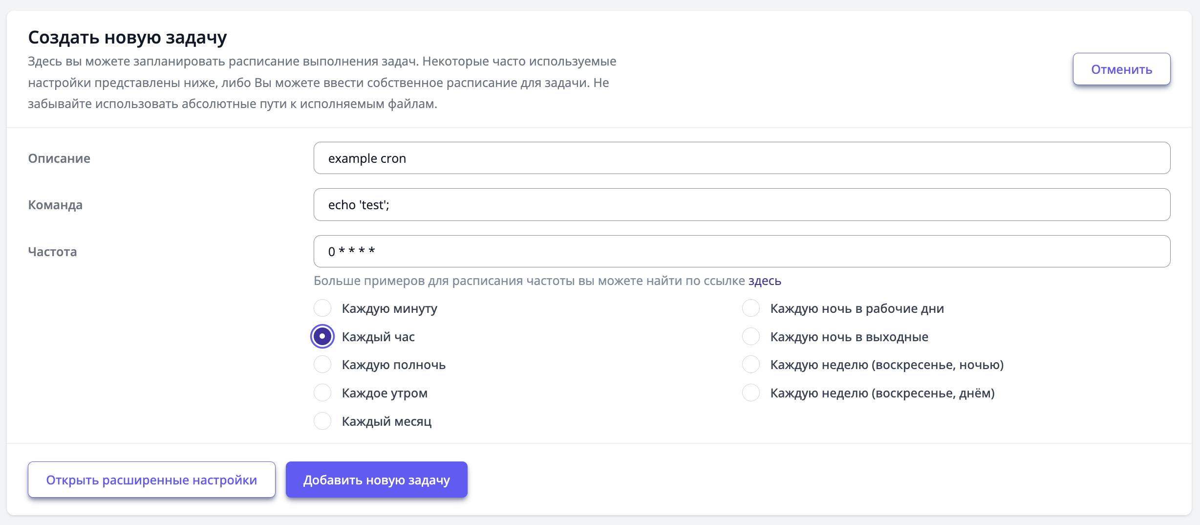 Scalesta позволяет управлять активными задачами планировщика через меню Планировщик. Чтобы добавить или удалить задачу, выберите нужный сервер, перейдите в Панель управления сервером, найдите пункт Планировщик и откройте его. Введите Описание задачи , саму команду в поле Команда и выберите частоту запуска из рекомендуемых или укажите другую частоту в поле Частота. Когда все параметры введены, нажмите Добавить новую задачу — Готово , задание планировщика добавлено в конфигурацию сервера.