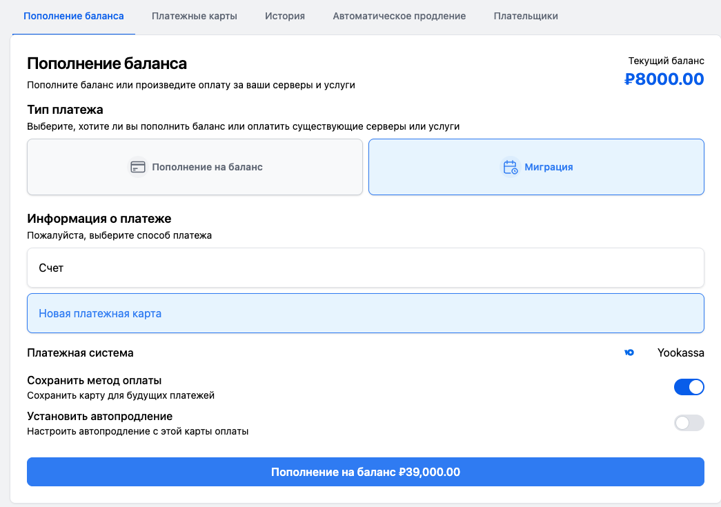 Оплата сервера при миграции становится доступной только после согласования тарифа и подтверждения миграции. После создания услуги для сервера в списке серверов вашего проекта появляется иконка для перехода к оплате.