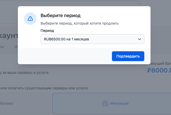 Открывается модальное окно для выбора периода оплаты (аналогично продлению сервера, но вы не можете отменить выбор сервера — только выбрать период и подтвердить).