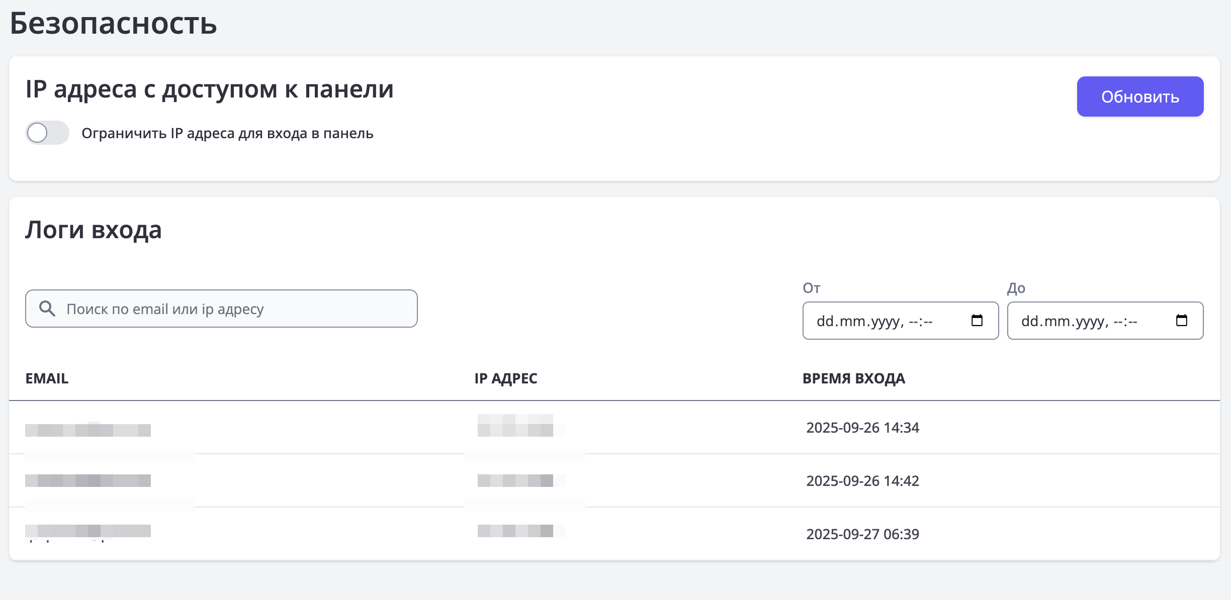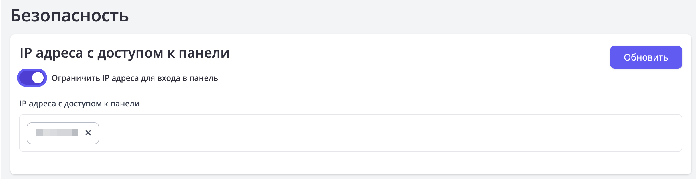 Вы можете ограничить доступ в панель по ip адресу. Для этого нажмите по переключателю "Ограничить IP адреса для входа в панель". После этого откроется поле для ввода ip адресов, которые смогут попасть в систему. По умолчанию будет выбран текущий ip адрес.