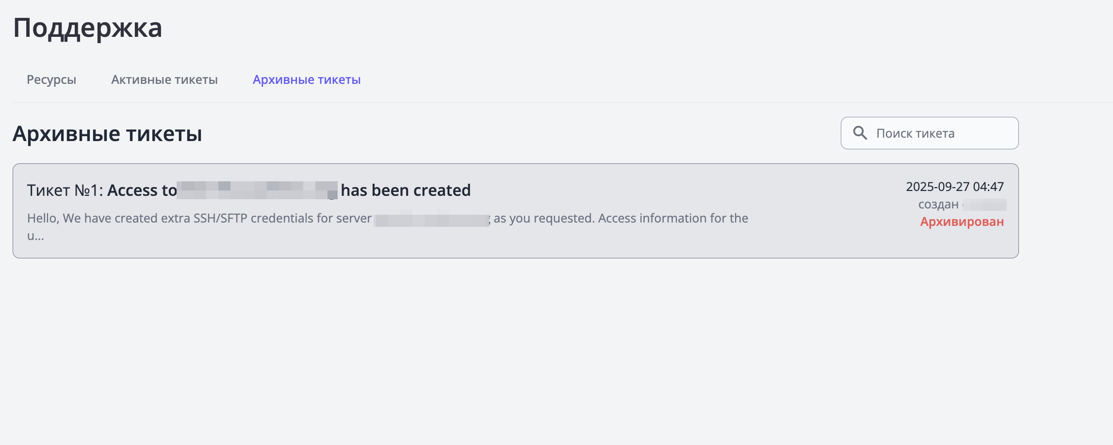- Архивирован — проблема решена и тикет был закрыт. В этом статусе вы не можете продолжать диалог в тикете, он доступен только для чтения.