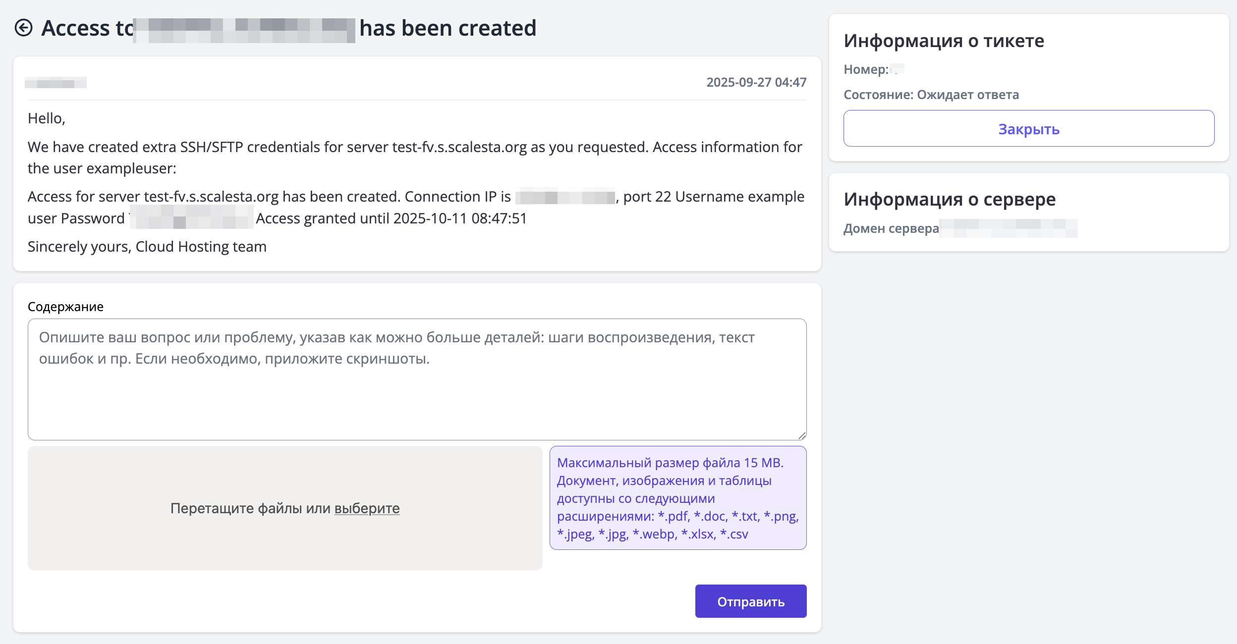 Тикет может быть создан из интерфейса Панели управления сервером Scalesta.