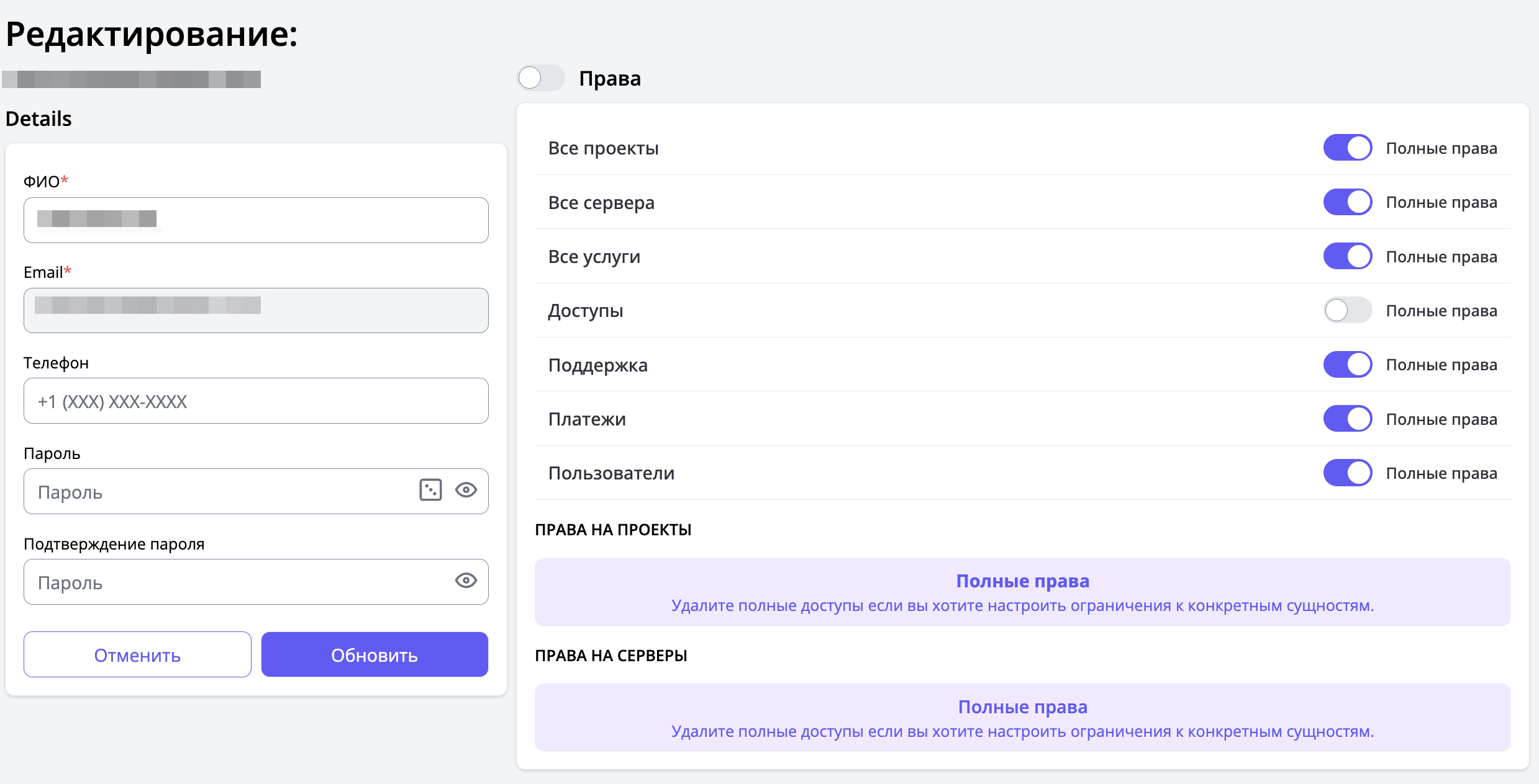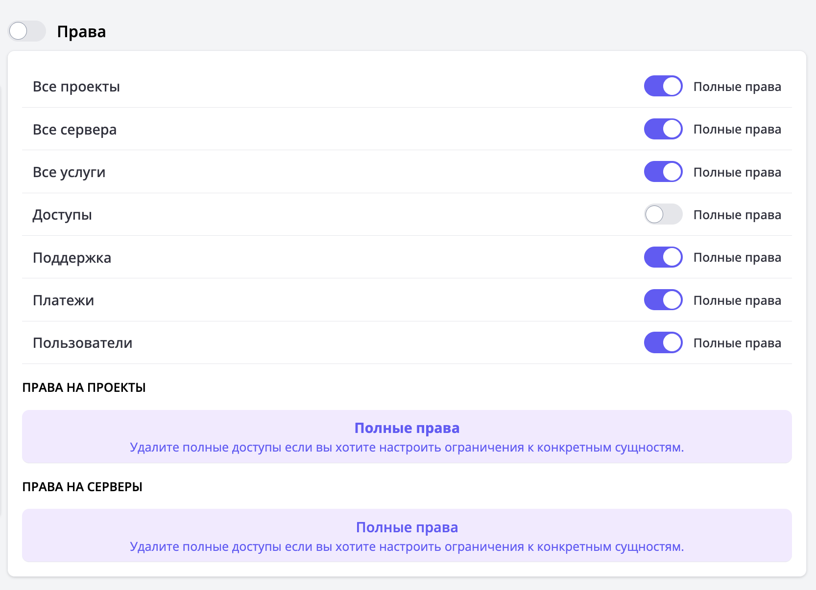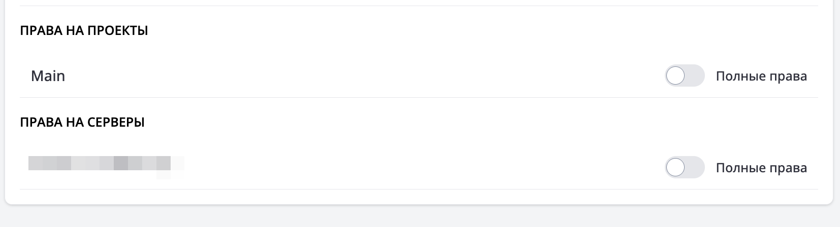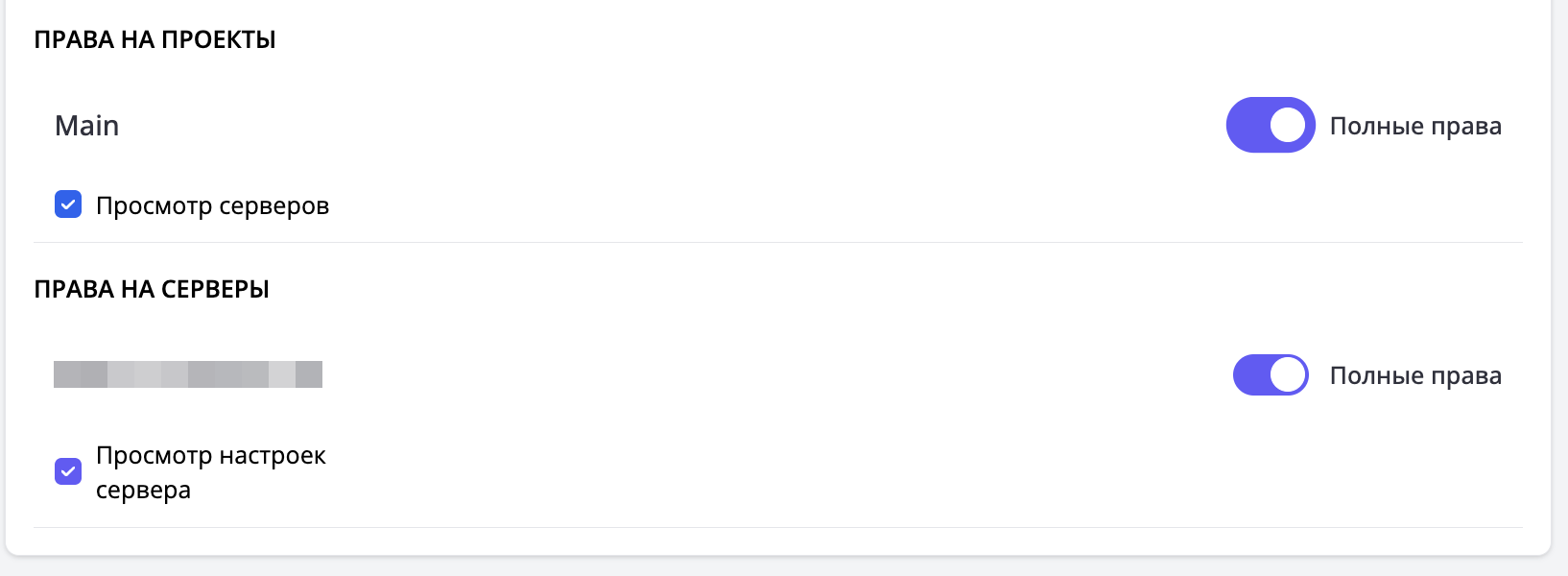- Выдача полных прав на работу с серверами активирует права просмотра списка и детальной страницы всех проектов по причине описанной в предыдущем пункте. Права на перенос серверов между проектами и удаление проектов не будут изменены.