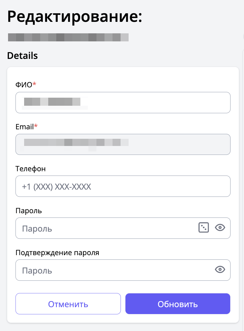 После этого откроется форма редактирования пользователя. Поле email не изменяемое. Изменение ФИО и пароля доступно всем пользователям с соответствующими правами, но редактирование прав доступов доступно только основному пользователю.