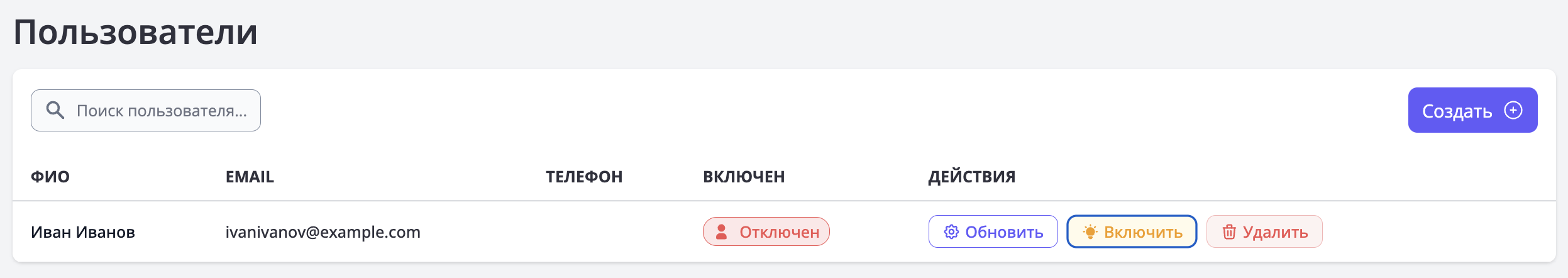 Вы можете временно отключить пользователя без удаления. Для этого нажмите на кнопку "Отключить" в списке пользователей.